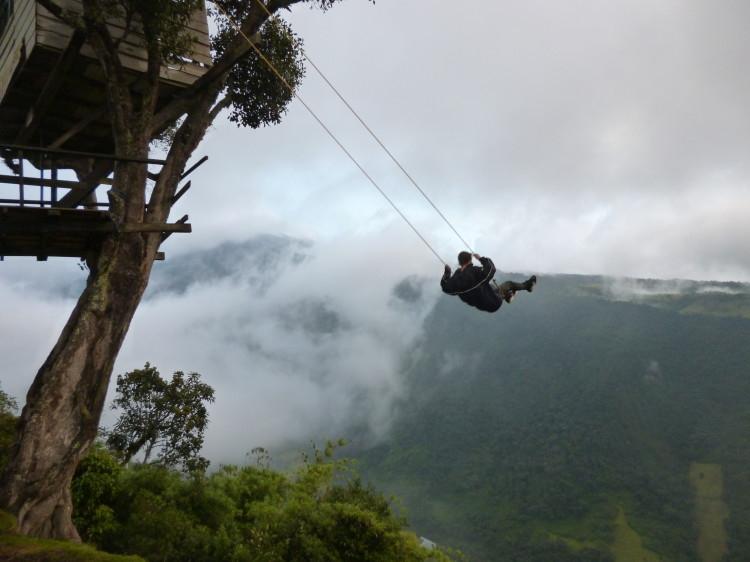 Nằm lơ lửng bên vách núi ở độ cao 2.660m, chiếc xích đu của ngôi nhà cây độc đáo trên núi tại Banos, Ecuador còn được biết đến là xích đu gây đau tim nhất trên thế giới với tên gọi “Xích đu tử thần”. Ngôi nhà cây ở đây thực ra là một trạm quan trắc địa chân để quan sát núi lửa Tungurahua gần đó. Chiếc xích đu được treo ngay bên cạnh cho du khách cảm giác thót tim khi đu đưa trên miệng khe núi sâu hun hút, và ngay bên dưới là vực sâu thăm thẳm nhưng quang cảnh hết sức ấn tượng. Chính điều này đã kích thích những tay du lịch vừa thích mạo hiểm và vừa ưa lãng mạn. Chiếc xích đu với thiết kế đơn sơ, không thiết bị bảo hộ, chỉ có dây thừng và miếng gỗ treo từ một cành cây. Tầm đánh đu của nó có thể 1 phát đưa người bay ra khỏi hẻm núi và chơi vơi giữa khoảng không, chen lẫn những đám mây.