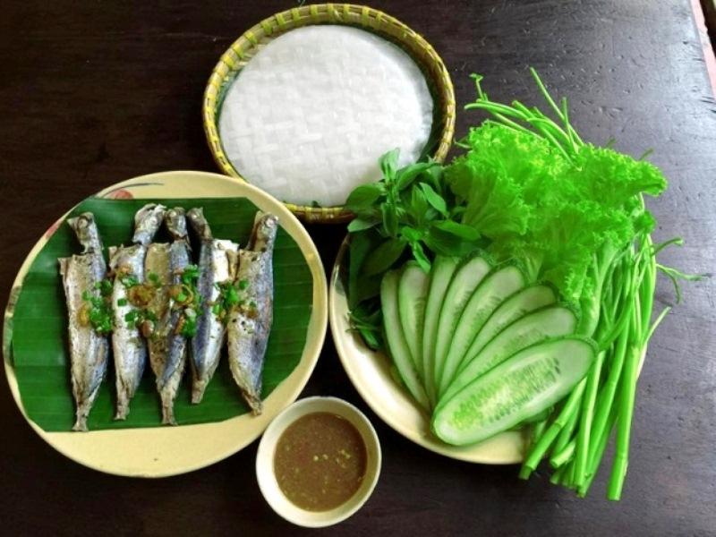 Cá nục, rau muống cuốn bánh tráng -