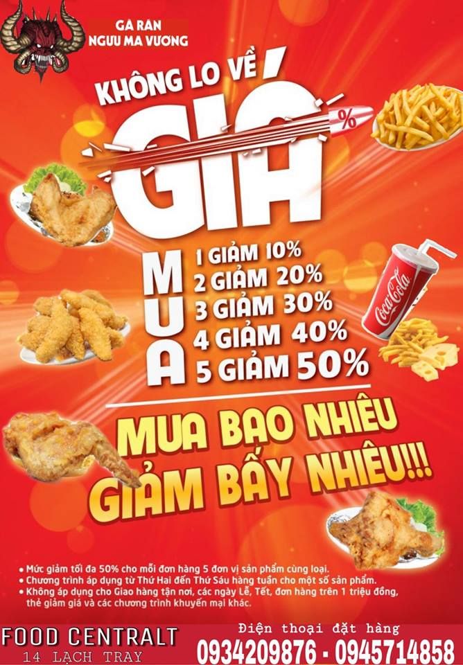 Gọi điệnBụng đói rồi, ăn gì đây ta? Lấp đầy chiếc bụng đói của mình bằng những phần gà rán sốt ngon mê mẩn, tại sao không? Nếu bạn đang đi trên con đường Lạch Tray mà muốn ăn gà rán thì bạn có thể đến với gà rán Ngưu Ma Vương. Một miếng gà thành phẩm của Ngưu Ma Vương vừa có vẻ ngoài bắt mắt hấp dẫn mà lại còn mang trên mình hương thơm cuốn hút không kém. Bên ngoài được “khoác” một lớp bột giòn, che đậy bên trong là lơp thịt dày, ấm nóng với đọng nước. Cùng rủ nhau đến gà rán Ngưu Ma Vương để thưởng thức hương vị tuyệt vời của thương hiệu đến từ Đài Loan các tình yêu nhé!