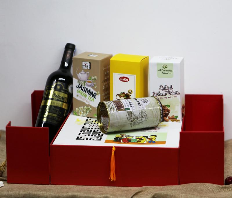 - Set quà theo yêu cầu, kèm thiệp chúc mừng năm mới và in logo doanh nghiệp miễn phí.