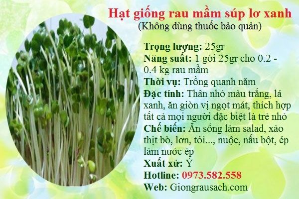 Gọi điệnMuốn mua hạt giống rau mầm ở Hà Nội thì nên mua ở cửa hàng hạt giống nào đảm bảo chất lượng. Đây là điều mà nhiều người không khỏi thắc mắc khi có nhu cầu trồng rau mầm tại nhà. Hạt giống rau mầm có nhiều loại, để chọn được loại đảm bảo chất lượng và năng suất cây trồng, bạn cần lưu ý một số tiêu chí sau: hạt giống phải còn hạn sử dụng, bạn cần lưu ý để hạn sử dụng của hạt giống khi mua, bởi nếu hạt giống đã quá hạn sử dụng thì sẽ rất khó nảy mầm hoặc nếu có nảy mầm thì cây sẽ rất dễ mắc bệnh và rất yếu.