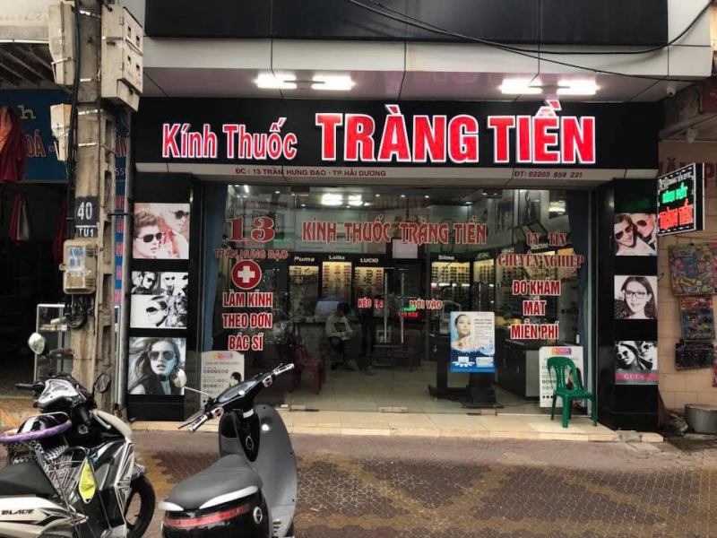 Gọi điệnKính mắt Tràng Tiền là địa chỉ cắt kính các loại, trong đó có kính cận quen thuộc và nổi tiếng tại Hải Dương. Kính mắt Tràng Tiền chuyên kinh doanh kính cận học sinh, kính viễn, kính lão, mắt mổ cườm, mắt loạn thị, mắt hai tròng, đa tròng,... Và các loại kính thời trang của nhiều thương hiệu nổi tiếng trên thế giới: Rayban, Stepper, Cadillac, Dior,... Không chỉ sở hữu những loại gọng kính cao cấp, Kính mắt Tràng Tiền còn có những gọng kính đơn giản, bình dân, trải đều nhiều mức giá thành khác nhau, phù hợp với nhiều đối tượng từ học sinh, sinh viên đến những người đã đi làm.