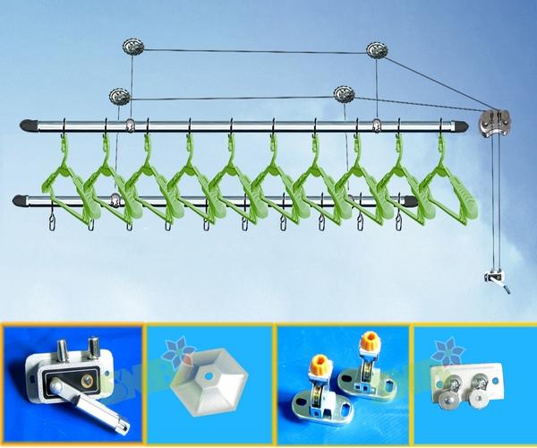 - Giàn phơi quay tay gắn trần: Giàn phơi gắn áp trần, nâng hạ bằng hệ thống cáp ròng rọc, điều khiển hai thanh phơi bằng tay quay, chất liệu làm bằng Nhôm mạ màu cao cấp & sang trọng.