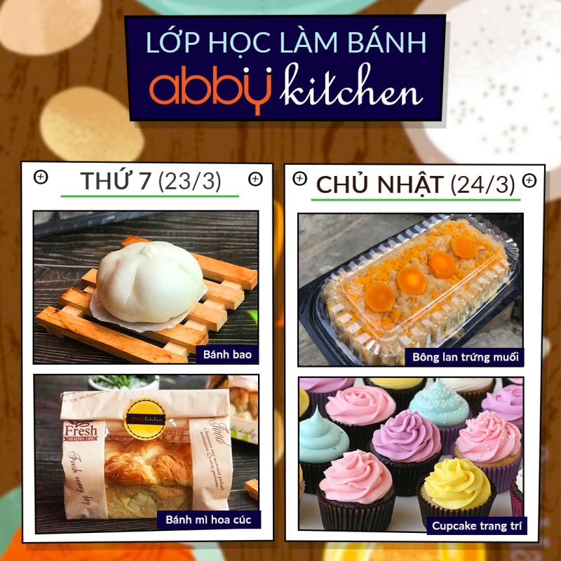 Một đặc điểm rất thú vị của Abby là thời gian học rất linh hoạt, bạn có thể đến bất kì lúc nào trong giờ mở cửa mà không cần đặt lịch trước. Tuy nhiên các khóa học ở Abby chỉ có những lớp dành cho bánh gato, cupcake, cookies và bánh Trung Thu. Ngoài ra, Abby còn là một địa chỉ cung cấp dụng cụ và nguyên liệu làm bánh. Abby là chuỗi cửa hàng cung cấp đồ làm bánh, đồ nấu ăn và pha chế. Các sản phẩm của Abby sẽ giúp bạn nấu các món ăn, đồ uống ngon như ngoài hàng, với chi phí tiết kiệm hơn.