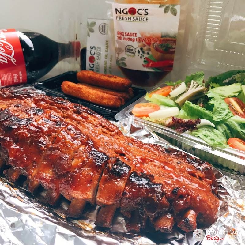 Bạn mê sườn nướng, nhưng quá xa những quán được đề cập ở trên? Bạn mê sườn, song thích nhâm nhi tại nhà thay vì đến những nhà hàng đông đúc? Ngoc’s Freshsauce đích thực là dành cho bạn. Với gần 15 nghìn lượt theo dõi trên trang facebook, chất lượng sườn nướng tại Ngoc’s Freshsauce là chẳng thể nghi ngờ. Quán chuyên bán online, thời gian giao hàng nhanh, đóng gói bằng hộp carton cứng cáp, bọc bằng giấy bạc, đảm bảo khi đến tay khách hàng, sườn vẫn còn nguyên độ ấm. Mở hộp sườn ra, ắt hẳn bạn sẽ ấn tượng với dẻ sườn to dài, dầy dặn, mang màu vàng nâu đẹp mắt, tỏa hương thơm ngào ngạt. Thịt sườn đủ nạc và mỡ, ngọt mềm, có độ giòn tan nhất định, ăn kèm cùng nước sốt BBQ thần thánh, là sự lựa chọn không thể chê được với một mức giá khá “bình dân”.