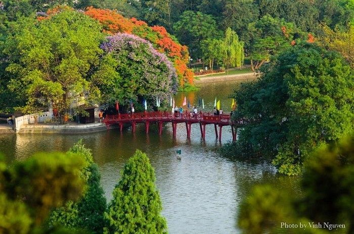 Nhắc tới Hà Nội người ta nghĩ ngay tới Hồ Gươm, nơi gắn liền với truyền thuyết trả gươm cho Rùa Vàng và ghi lại thắng lợi lừng lẫy trong cuộc kháng chiến chống quân Minh. Hồ Gươm là một trong những địa điểm du lịch đẹp ở Hà Nội được khách du lịch cực kì ưu ái. Hồ Hoàn Kiếm (hay còn gọi là Hồ Gươm) là nơi chốn tổng hòa của nhiều công trình kiến trúc. Đó là Đền Ngọc Sơn, Cầu Thê Húc, Tháp Rùa, Tháp Bút, Đền Bà Kiệu, Tháp Hòa Phong. Tất cả hòa quyện trong không gian xanh mướt của hoa lá cỏ cây như sự hài hòa của thiên tạo và nhân tạo.