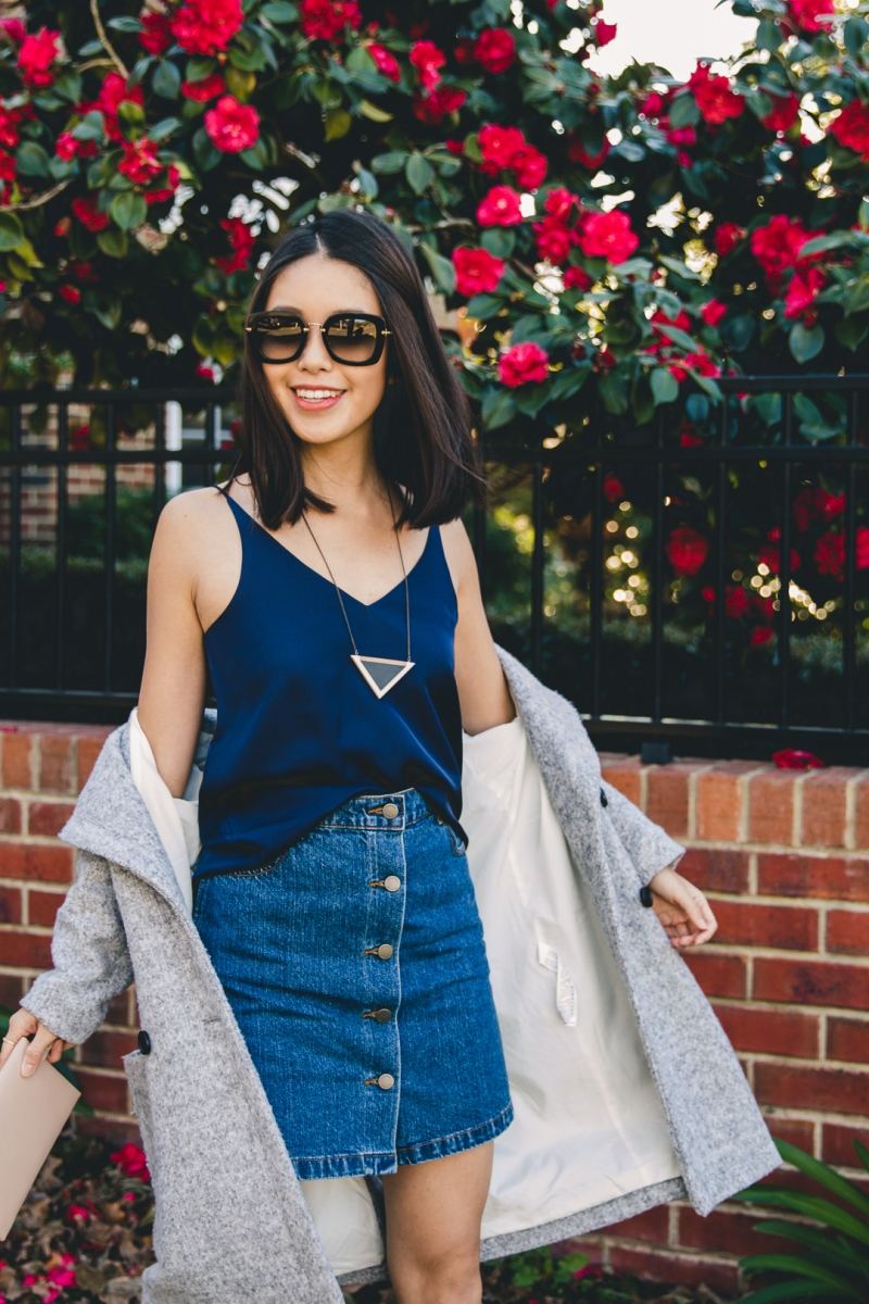 Áo yếm hai dây với chân váy denim cạp cao cho cô nàng ngực nhỏ