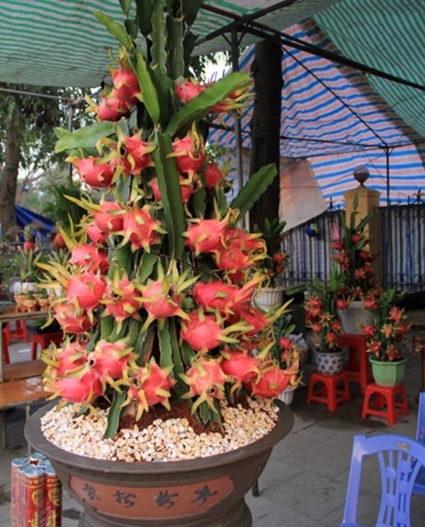 Một chậu thanh long được tạo từ nhiều cành ghép lại với nhau và có rất nhiều trái mọc san sát trên cành mang ý nghĩa sum họp đầy đủ.