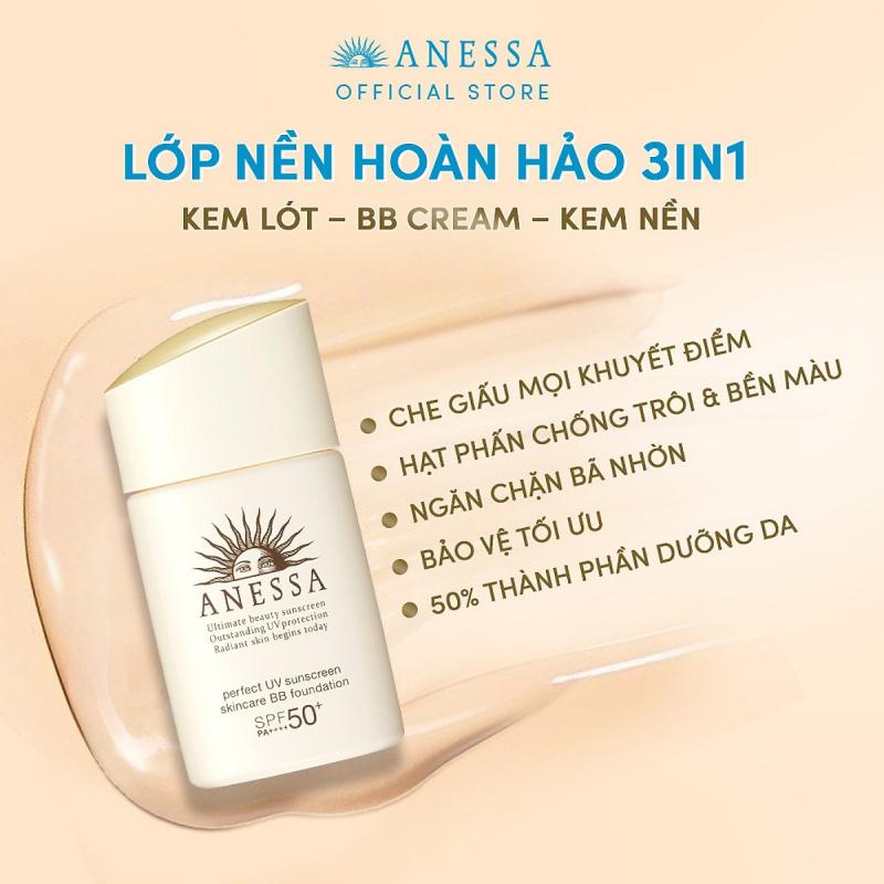 Kem nền trang điểm Anessa BB chống nắng dưỡng da SPF 50+ PA++++ đến từ thương hiệu Anessa nổi tiếng về các sản phẩm chống nắng. Kem nhờ công nghệ Time Control Powder kiểm soát dầu giúp lớp nền khô ráo và mịn mượt suốt cả ngày. Ngoài ra, hiệu quả chống trôi do nước và mồ hôi rất cao với công nghệ Aqua Booster. Bên cạnh đó, thành phần dưỡng da giúp chống lại thương tổn do tia UV.