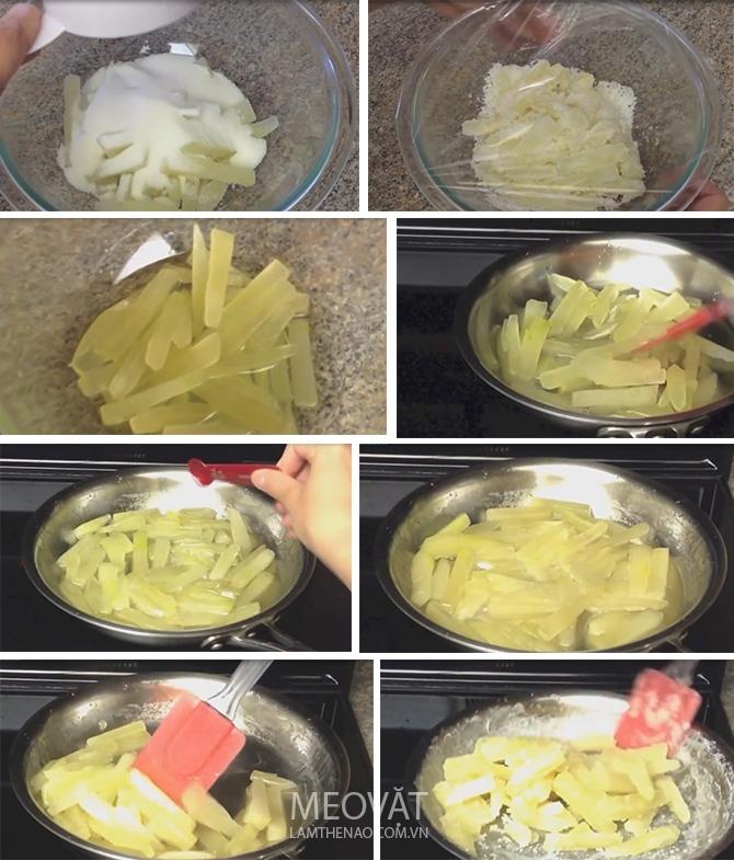 - Đến khi đường kết tinh, bạn vẫn đảo tay liên tục để cho các miếng khoai tách riêng biệt không dính. Cuối cùng bạn cho hương vani vào, đun thêm một phút nữa thì tắt bếp.