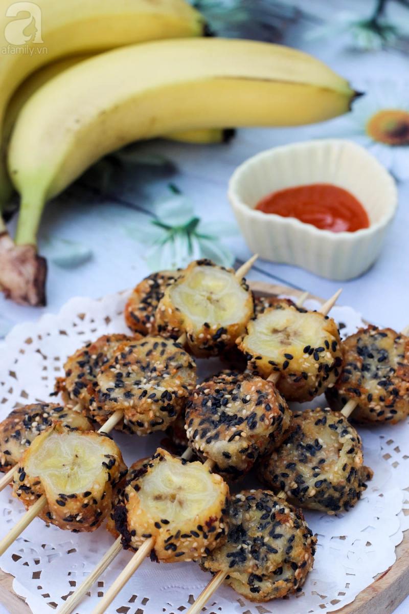 - Dùng xiên que xiên từng miếng chuối vào xiên và thưởng thức thôi!