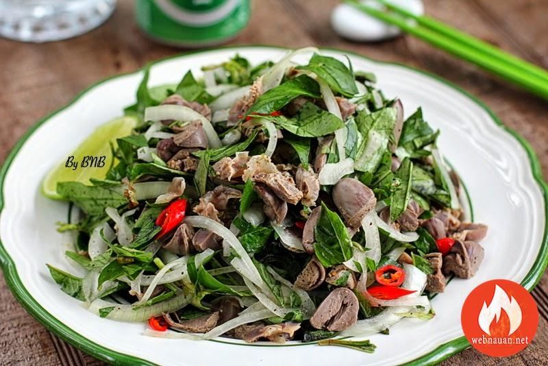 - Chọn 1 bát tô sạch. Cho toàn bộ tim gà và mề gà vào. Đổ nước gia vị vào rồi trộn đều. Trộn từ từ khi nêm lại thấy vừa ăn là được. Cho hành tây, rau răm vào trộn đều rồi cho ra dĩa dùng liền, thêm một ít ớt thái lát nếu thích ăn cay.