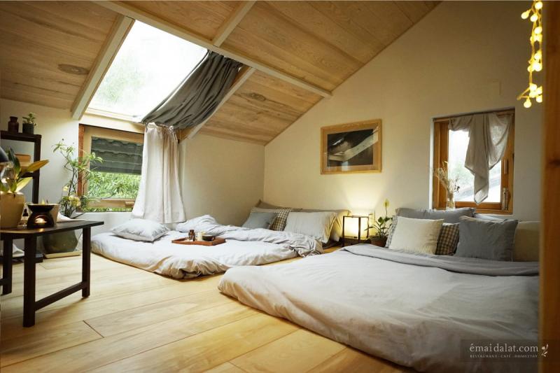 Émai Dalat có view lý tưởng để bạn đắm chìm trong sự trong lành của thành phố Đà Lạt. Nơi này không quá rộng nhưng rất thoáng. Ghi điểm với cách bài trí tinh tế và cách thiết kế ánh sáng thông minh, Émai Dalat sang trọng nhưng có điều gid đó gần gũi và nên thơ khiến người ta lưu luyến chẳng rời. Không gian đẹp món ăn cũng đẹp như vậy, hương vị lại "xứng đôi vừa lứa" với vẻ ngoài. Đến Émai Dalat mang lại cho bạn cảm giác riêng tư và thư thái khi đến dùng bữa.