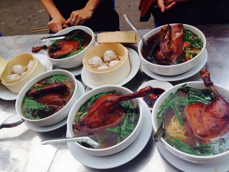 Vịt quay Quảng Đông là đặc sản mà bạn không thể bỏ qua khi thưởng thức ẩm thực Trung Hoa. Tuy nhiên ở Hà Nội, bạn cũng có thể dễ dàng tìm được hương vị chuẩn Vịt quay Quảng Đông ngay tại con phố Thái Thịnh. Người Quảng Đông để làm nên món ăn được du khách gần xa ngưỡng mộ phải chú trọng ngay những khâu nhỏ nhất. Sau khi vặt sạch lông, con vịt không được mổ phanh như cách chúng ta vẫn làm. Chỉ khoét một lỗ nhỏ trên mình con vịt lấy nội tạng ra. Với cách làm này khi nướng vịt không những mềm, không mất nước mà thịt cũng ngọt và đậm đà hơn.