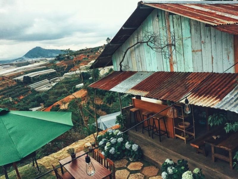 Nếu thích không gian thoáng đãng bên ngoài với view nhìn toàn cảnh thành phố, bạn có thể chọn ngồi tại bộ bàn ghế gỗ, tầm nhìn xuống khu nhà lồng trồng rau bên dưới. Nơi đây là điểm chụp hình lý tưởng của những ai đam mê sống ảo. Nhâm nhi tách cà phê thơm lừng giữa hương thoang thoảng của cúc họa mi trong gió mang đến cảm giác thật thi vị trong những ngày thu đông ở Đà Lạt tại Tiệm Cà Phê Túi Mơ To.