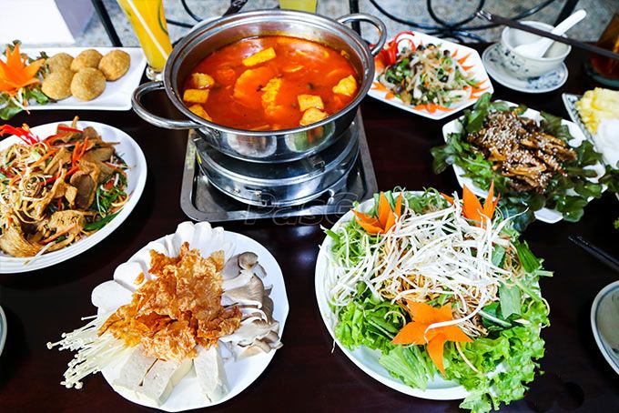 Một số món ăn nổi bật của địa chỉ này là Lẩu rong biển, lẩu tomyum, lẩu tokbokki,... với phiên bản lẩu chay, bạn vẫn sẽ có một nồi lẩu với nước dùng thanh nhưng không hề nhạt, topping phong phú không hề đơn điệu.