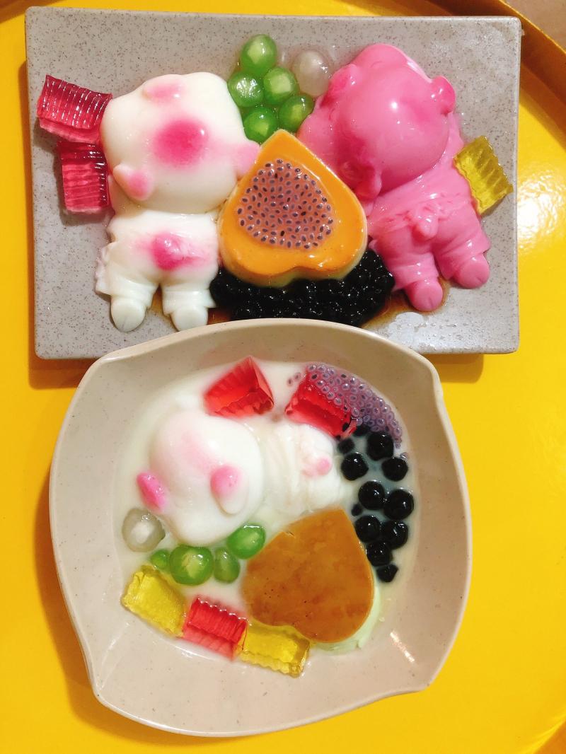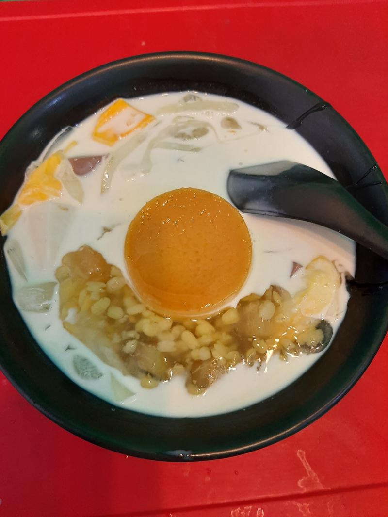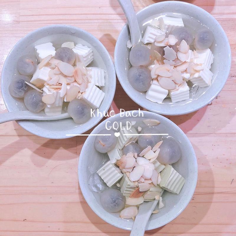Chè khúc bạch của quán được làm nên bởi các nguyên liệu gồm sữa, gelatin, long nhãn, hoa quả, sắn dây. Tất cả chúng hòa quyện và kết hợp với nhau, tạo nên một thức quà thơm mát, ngon không thể cưỡng lại.