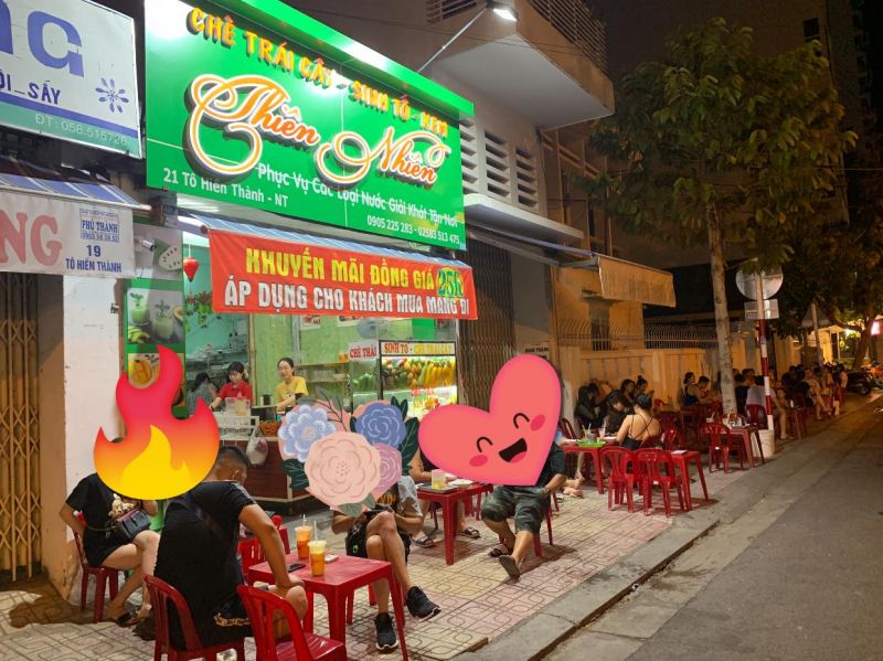 Gọi điệnSinh Tố Thiên Nhiên Nha Trang nằm trên đường Tô Hiến Thành là địa chỉ bán chè ngon rẻ được nhiều thực khách yêu thích lựa chọn ở Nha Trang. Menu ở quá khá đa dạng với các loại chè, trái cây và sinh tố. Phục vụ quán khá nhanh nhẹn, thân thiện, không gian thoáng mát, rộng rãi, có thể ngắm cảnh phố phường về đêm huyên náo, nhộn nhịp.
