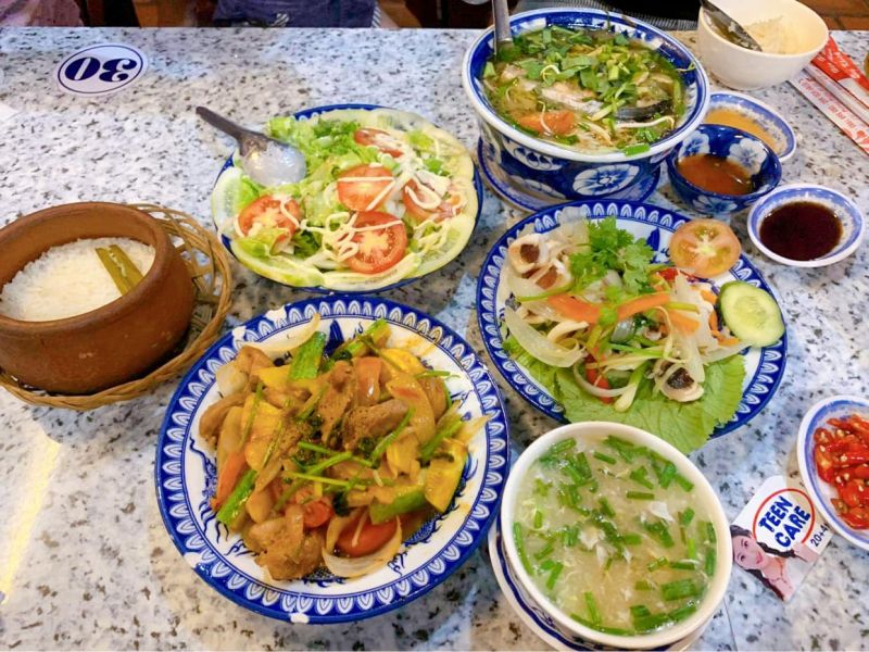- Thực đơn đa dạng: cá kho, bò xào, canh chua, mắm Huế, rau luộc chấm kho quẹt...
