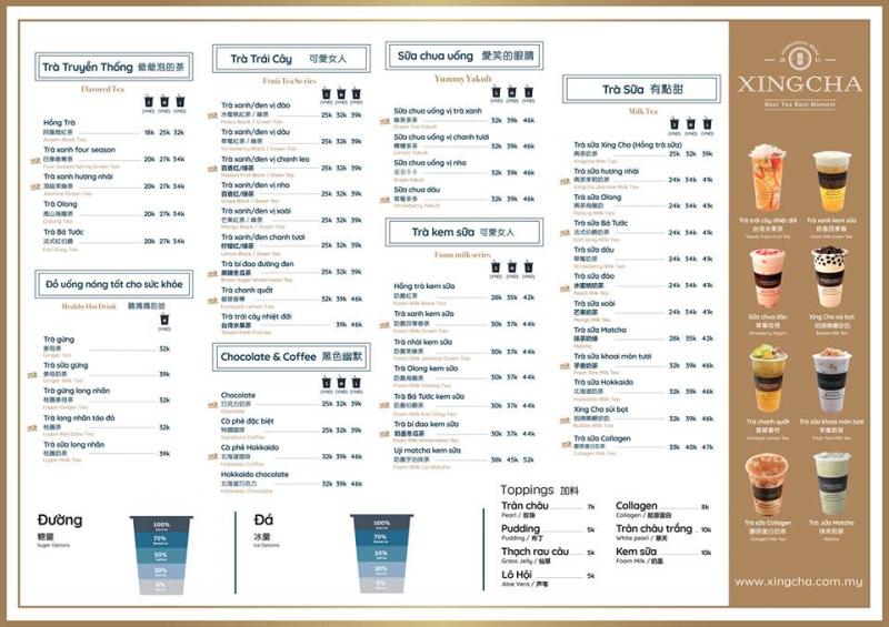 Menu XingCha có hơn 100 loại đồ uống cho thực khách thoải mái lựa chọn sao cho phù hợp với sở thích. Trong đó chia làm 9 nhóm đồ uống chính đó là: Trà sữa, Cà phê đặc biệt, Đồ uống đá xay, Nước trái cây, Yakult, Trà vị trái cây, Trà kem sữa mặn, Đồ uống nóng có lợi cho sức khỏe và Trà truyền thống.