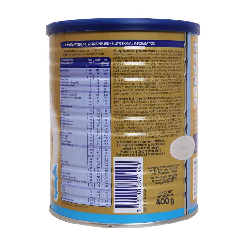 Thành phần: Bột sữa, lactose, bột galacto – oligosaccharides (Gos), bột whey giàu đạm, khoáng chất (sắt sunphat, Kẽm sunphat, đồng sunphat, mangan sunphat, kali iodua, natri selenit), dầu cá, dicanxi photphat, nucleotides, vitamin , cholin bitartrat.