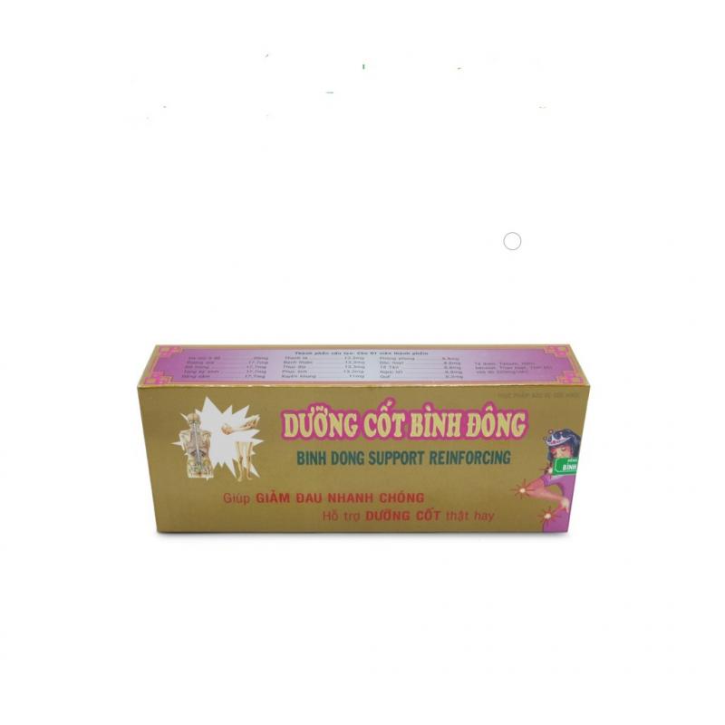 Dưỡng Cốt Bình Đông là sản phẩm của Công ty TNHH Dược Phẩm Bình Đông, được kế thừa tinh hoa Y học cổ truyền với thành phần tự nhiên có tác dụng bổ khí huyết, hoạt huyết hành khí, thông kinh lạc, khu phong trừ thấp, tán hàn. Giúp khí huyết dễ lưu thông, giảm các triệu chứng như đau thần kinh tọa, đau lưng, mỏi gối, chân tay tê mỏi.