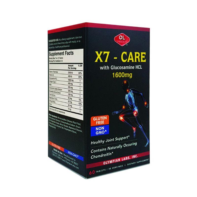 Chính vì vậy, người bệnh cần phải bổ sung Glucosamine qua đường ăn uống. Olympian Labs X7 Care là giải pháp giúp người bệnh bổ sung Glucosamin, giúp tái tạo sụn, tiết dịch khớp, giảm khô khớp, giảm tình trạng sưng viêm, đau nhức các khớp, giúp vận động dễ dàng, linh hoạt hơn. Olympian Labs X7 Care tác động toàn diện trên cả cơ - xương - khớp giúp tái tạo sụn, tiết dịch khớp, giảm khô khớp, giảm tình trạng sưng viêm, đau nhức các khớp, giúp vận động dễ dàng, linh hoạt đồng thời giúp ngăn ngừa thoát vị đĩa đệm, hỗ trợ cho người bị các vấn đề về đĩa đệm...