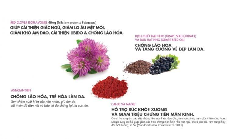 - Tinh chất hoa anh thảo kết hợp cùng cao sâm tố nữ và vitamin E giúp hỗ trợ bổ sung nội tiết tố nữ.