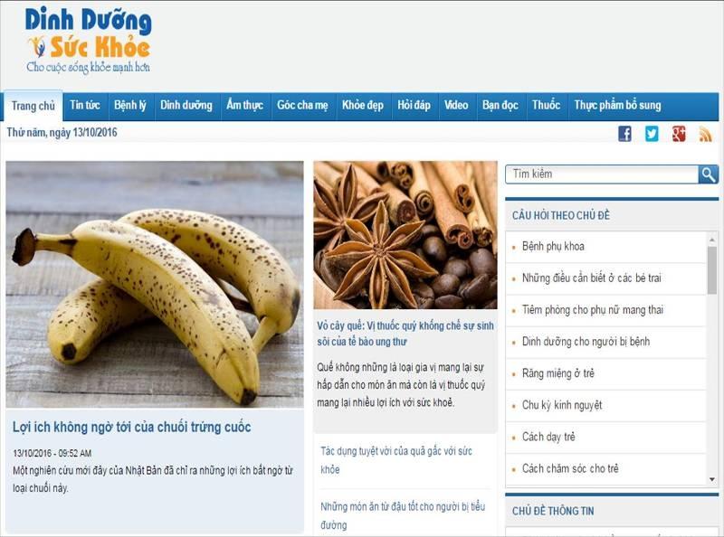 Dinh dưỡng là website được xây dựng tập trung vào nhiều khía cạnh của sức khỏe, nhất là các kiến thức xoay quanh chủ đề dinh dưỡng. Một số chủ đề nhận được nhiều sự quan tâm nhất của bạn đọc như chế độ dinh dưỡng cho phụ nữ có thai, cho trẻ em ở những độ tuổi khác nhau, cho người cao tuổi, chế độ dinh dưỡng hộ trợ phòng và điều trị bệnh.