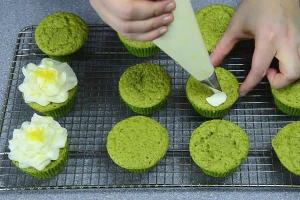 Lưu ý: Chia phần đường ra làm 2 hoặc 3 phần và cho vào từ từ chút một. Tránh cho vào hết một lần. Lòng trắng trứng cần để ở nhiệt độ thường trước khi đánh bông. Chia phần trứng bông làm 3 phần, cho từng phần vào hỗn hợp bột bánh rồi dùng phới dẹt trộn nhẹ nhàng hỗn hợp theo chiều từ dưới lên trên. Đưa phới xuống dưới đáy âu, đẩy nguyên liệu nặng lên và hất sang một bên theo kiểu fold. Tiếp tục thao tác đến khi hỗn hợp hòa quyện. Lưu ý: Cần trộn đúng kỹ thuật Fold để tránh làm vỡ các bọt khí nhỏ, bánh sẽ không nở bông xốp được.